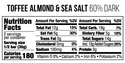 Ingredients: Organic Cacao Beans, Organic Cane Sugar, Organic Toffee (Organic Evaporated Cane Juice, Sea Salt, Natural Flavor, Organic Caramel Color), Organic Almonds, Organic Cocoa Butter, Sea Salt. Contains Almonds. May Contain Traces of Other Tree Nuts and Sesame Seeds.